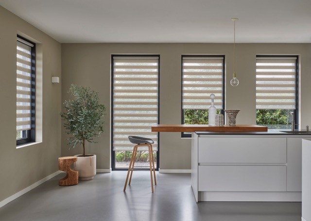 El funcionamiento de estos estores se basa en una alternancia de franjas horizontales de ambos tejidos (opacos y traslúcidos), lo que permite que al mover el estor hacia arriba o hacia abajo, las franjas se alineen de manera que se pueda regular la cantidad de luz que entra en la habitación. Cuando las franjas opacas se alinean, bloquean la luz por completo, creando oscuridad total, mientras que las franjas traslúcidas permiten que entre luz de forma difusa. Este tipo de estores es perfecto para quienes buscan una solución versátil que se adapte tanto a la iluminación diurna como a la necesidad de privacidad por la noche, todo en un diseño moderno y elegante.